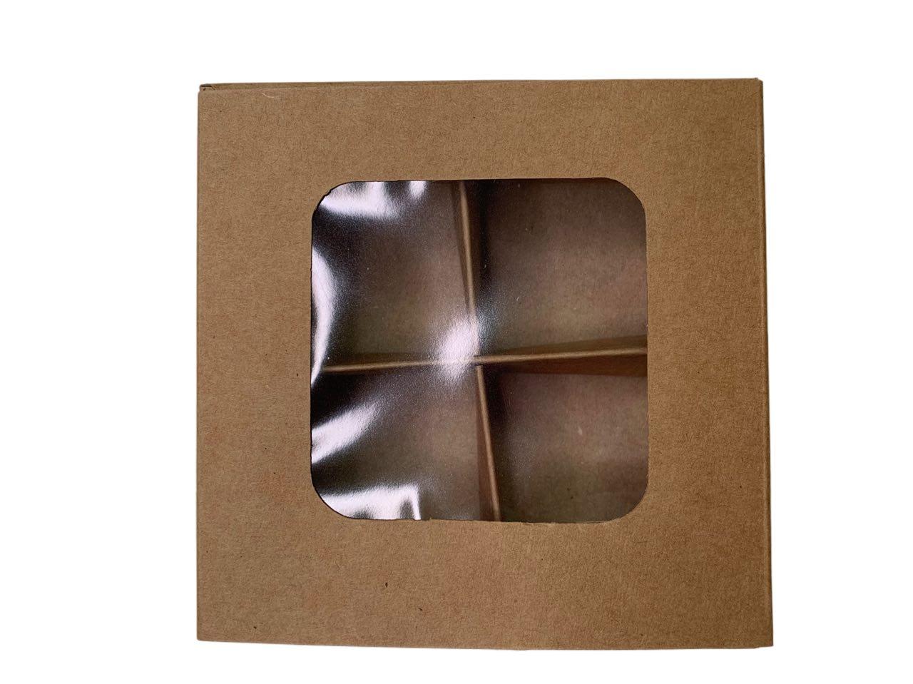 Коробка для 4 цукерок з бортиком з крафт-картону.Розмір зовнішній - 110*110*30 мм.Розмір комірки - 40*41*30 мм.В вартість коробки входить коробка з бортиками, футляр, перегородка.